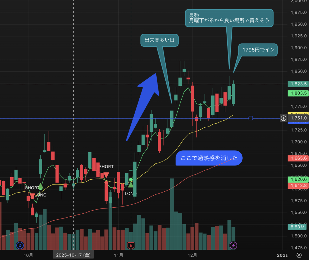 5日線(緑色)を実体で割らないようにとても意識されていると感じた。