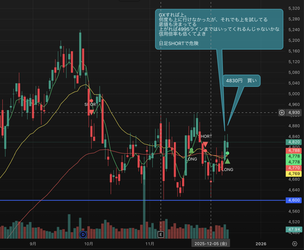 となると月曜の株価4820円は底値。ここから下げて12月の月足が5日線を割るより、上に行く可能性が高いと感じた。